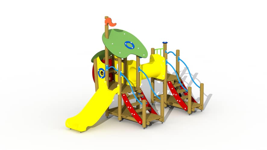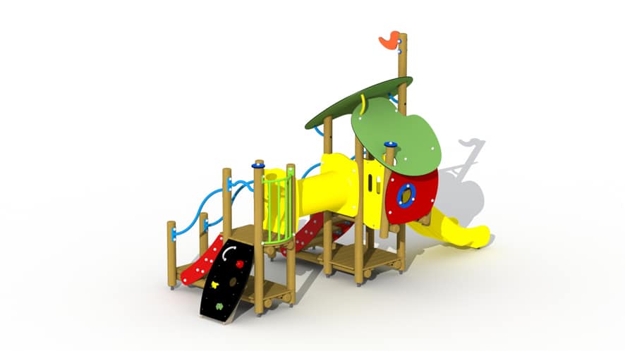 Kleurrijk combinatietoestel voor kinderen van 2 tot 6 jaar. Het speeltoestel bestaat uit een speelhuisje met een platformhoogte van 84 cm waarvan een kunststof glijbaan vertrekt. Het speelhuisje kan betreden worden via een gemakkelijke trap met metalen leuningen. Onderaan is een speelvloer voorzien, en bovenaan in het huisje is een bankje voorzien, het geheel wordt overdekt door een 2-ledig dak uit afgeronde kleurrijke HDPE polyethyleen panelen. Vanuit het speelhuis kan via een dubbelwandige HDPE polyethyleen doorkruipbuis naar een open platform gekropen worden. Aan het platform is een balustrade voorzien met een kleurrijk metalen hekje. Het platform kan beklommen worden via een gemakkelijke trap met metalen leuningen en een HDPE polyethyleen rotswand met kunststof klimgrepen. Onderaan is een speelvloer voorzien. De rondhouten lariks palen hebben een diameter van 10 cm en worden met metalen voetsteunen in of op de grond bevestigd.