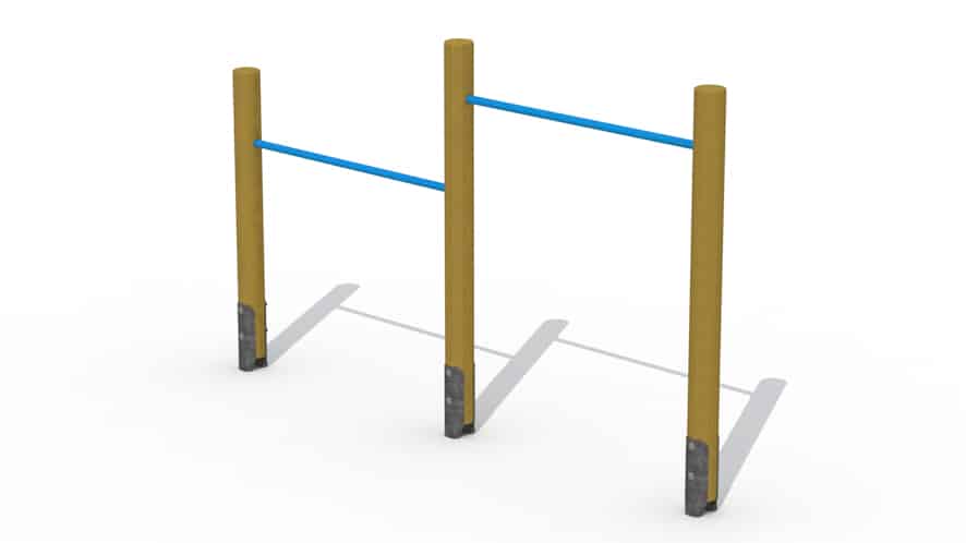 Houten duikelrek met 2 rekstokken voor kinderen vanaf 6 jaar. Kinderen kunnen aan de rekstokken hangen en draaien. De rekstokken komen op een hoogte van respectievelijk 1,06 m en 1,45 m. Er is een extra voorziening aanwezig tegen het verdraaien van de buizen. De rondhouten lariks palen hebben een diameter van 12 cm en worden met metalen voetsteunen in de grond bevestigd. Alle metaalonderdelen zijn roestvrij voorbehandeld en alle moeren en bouten worden volledig afgeschermd met kunststof afdekdoppen.