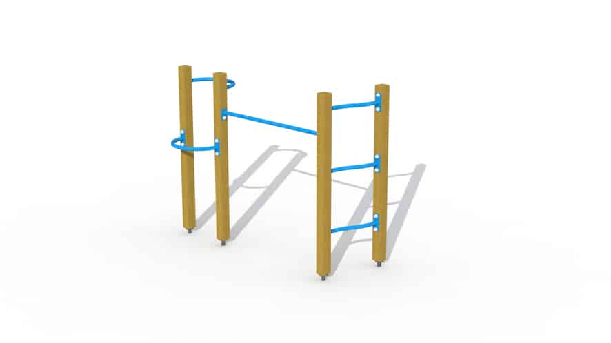 Tuimelrek voor kinderen van 4 tot 8 jaar. Dit tuimelrek bestaat links en rechts uit 2 beugelladders opgebouwd uit 2 lariks vierkante palen die verbonden worden via metalen polyester gecoate buizen. Deze beugelladders worden verbonden door een metalen polyester gecoate buis, op een hoogte van 1,30 m, waaraan gehangen en rondgedraaid kan worden. De vierkanten lariks palen van 9 x 9 cm worden met metalen voetsteunen in de grond bevestigd. Alle metaalonderdelen zijn roestvrij voorbehandeld en alle moeren en bouten zijn volledig afgeschermd met bloemvormige kunststof afdekdoppen.