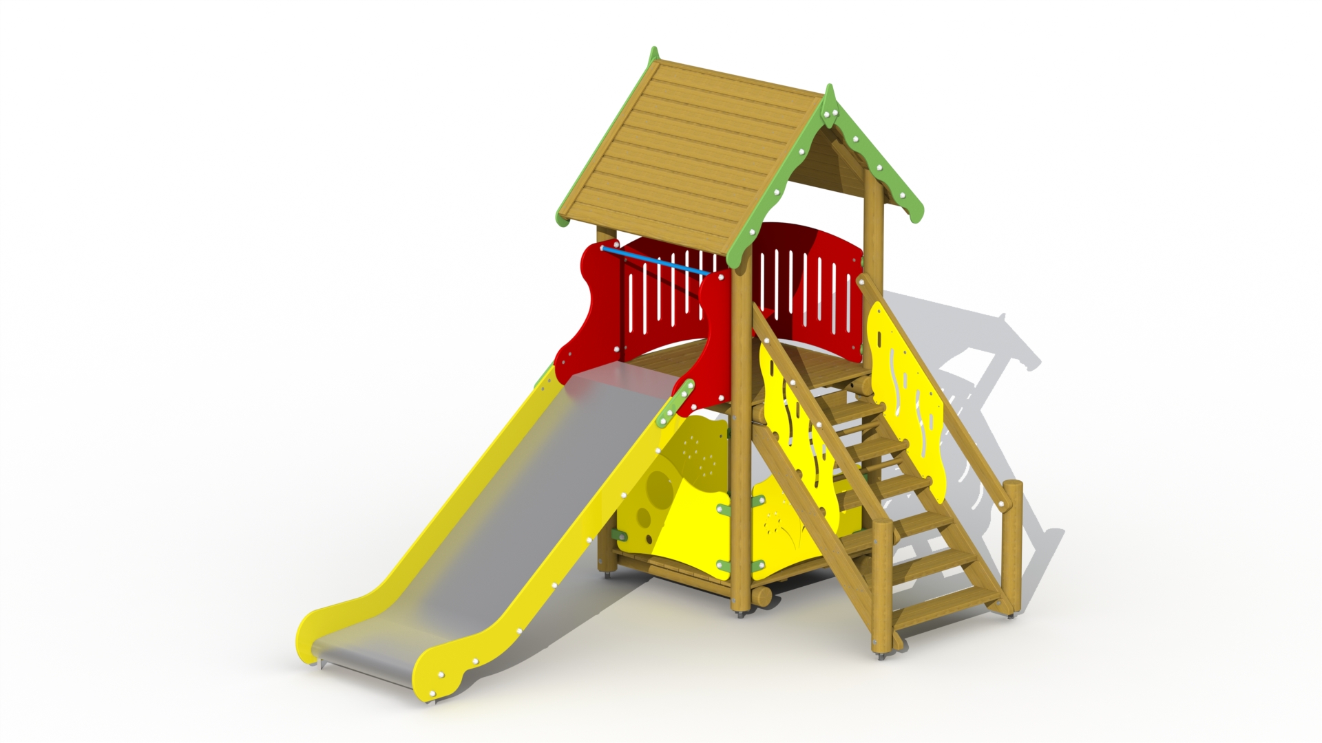 Een toestel met een verdieping gemonteerd op vier rondhouten lariks palen geschikt voor kinderen van 3 tot 12 jaar. Onderaan is een speelhuisje met vloer voorzien en bovenaan een platform met daarop een zadeldak. Het platform kan verlaten worden via een inox glijbaan van 1 meter breed en is anderzijds te bereiken langs een gemakkelijke trap. Het speelhuisje onderaan kan supplementair voorzien worden van twee zitbankjes en een tafeltje (S001). Daarnaast zijn ook nog volgende aanbouwelementen mogelijk: toogje met telraam (S003), klimboog (S006), rotswand (S007), lage glijstang (S008), zandwerkplaats (S009), aanbouwnet (S013), lage spiraalglijstang (S014) en/of spelpanelen (S033-S038). De rondhouten palen worden met metalen voetsteunen in of op de grond geplaatst. Alle metalen onderdelen zijn roestvrij voorbehandeld en alle moeren en bouten zijn volledig afgeschermd met bloemvormige kunststof afdekdoppen.Er is keuze tussen rode of groene zijwanden op alle structuren!