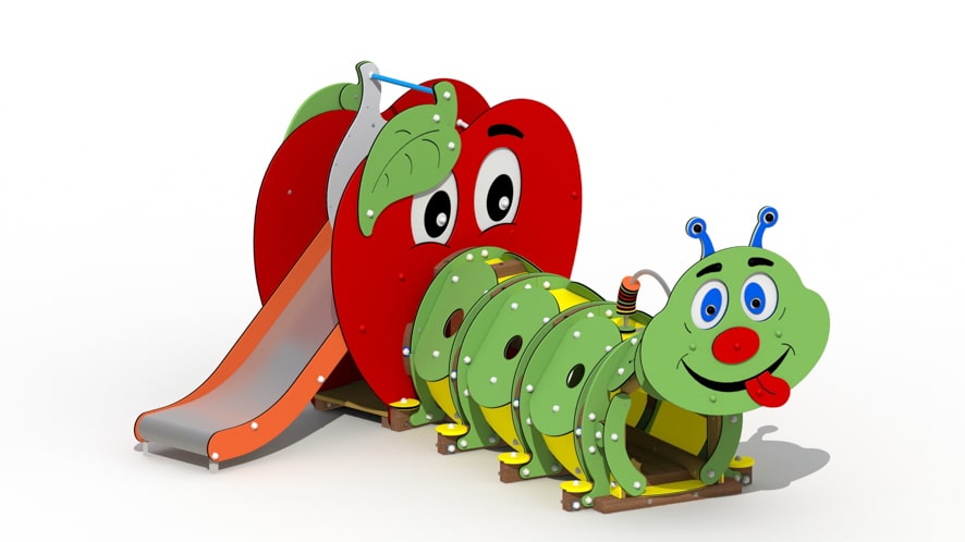 Een kleurrijk speeltoestel met een thema dat kinderen, maar ook volwassenen, uitnodigt tot het eten van gezonde voeding en tegelijkertijd de beweging stimuleert.De Rups is een speeltoestel voor kinderen van 2 tot 7 jaar in de vorm van een doorkruiprups met een glijbaan en een klimmuur opgebouwd in de vorm van een appel. Het toestel heeft een valhoogte van 1 m.De appel bestaande uit een glijbaan met HDPE polyethyleen glijboorden, een klimmuur en een telraam uit HDPE polyethyleen schijven. De metalen onderdelen zijn roestvrij behandeld en alle moeren en bouten worden afgeschermd door kunststof afdekdoppen.Op de rups kunnen vooraan optioneel twee extra spelpanelen bevestigd worden: schuifpuzzel (ref.L719) en/of vier op een rij (ref.L720).