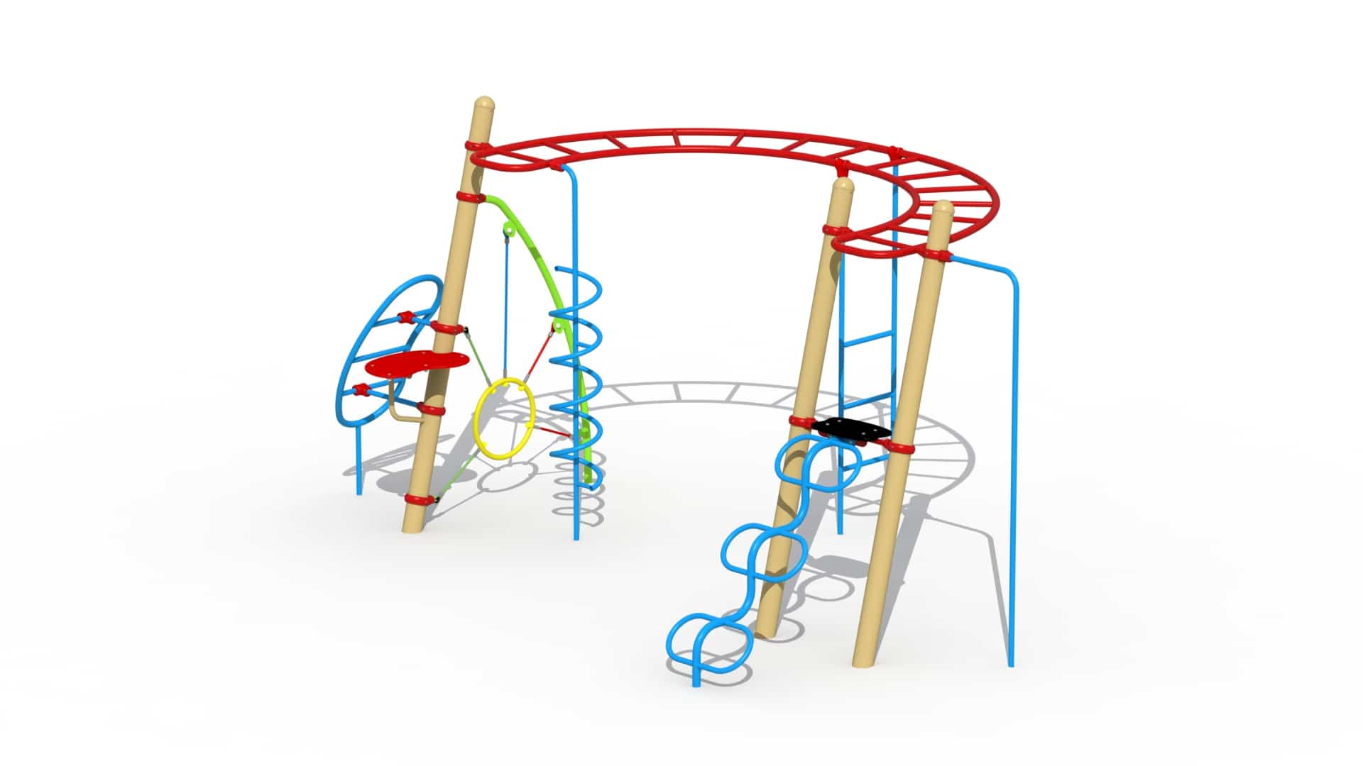 Uitdagend eigentijds klimtoestel voor kinderen van 6-15 jaar. Het speeltoestel bestaat uit 3 schuingeplaatste palen met diameter 127mm. Een horizontale U-vormige ladder met hangsporten bevestigd door middel van aluminium bevestigingsklemmen is voorzien van een spiraalglijstang, een rechte glijstang en middenin een verticale sportenladder. Aan de ene zijde van de U-vormige ladder bevindt zich een metalen boonvormige klimladder, een klimring opgespannen aan 16 mm polypropyleen touw met staalkabelversterking en een startplatform uit HDPE polyethyleen plaatmateriaal. De andere zijde van de U-vormige ladder is opgebouwd uit 2 schuingeplaatste palen die door middel van aluminium bevestigingsklemmen voorzien zijn van een startplatform uit HDPE polyethyleen.