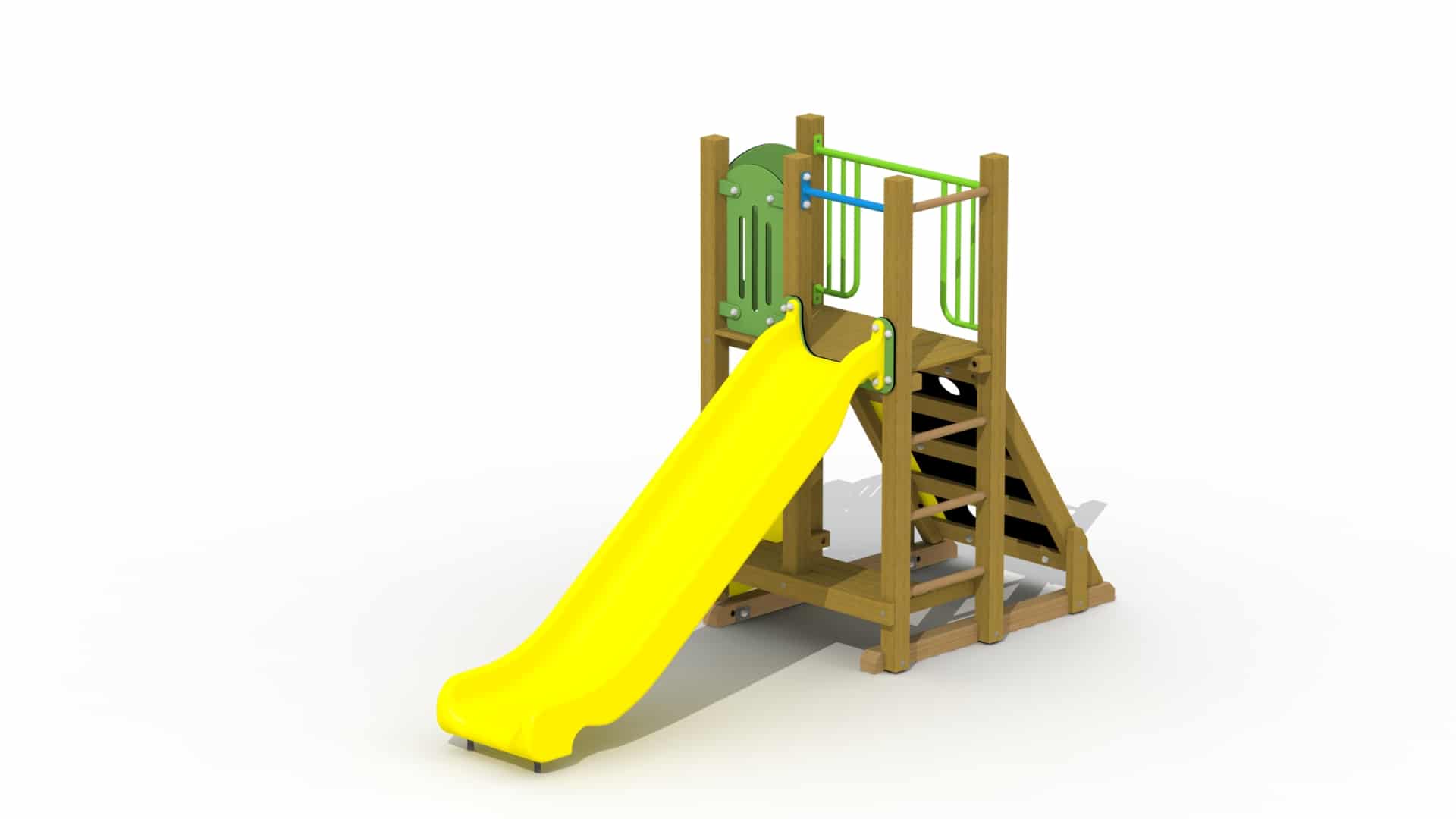 Een klimtoestel met een rotswand langs de ene zijde en een kunststof glijbaan en verticale ladder aan de andere zijde voor kinderen van 3 tot 12 jaar. Onderaan is een speelhuisje met zitbankje voorzien. Het geheel is ideaal voor reeds verharde oppervlakten omdat alleen de glijbaan in de grond verankerd moeten worden. De bevestiging van de onderbalken kan gebeuren met grondankers (T600). Hiervoor is beton nodig. Alle metalen onderdelen worden roestvrij voorbehandeld en alle moeren en bouten worden volledig afgeschermd met bloemvormige kunststof afdekdoppen. Aan dit toestel kan een extra rechte glijstang (ref. S010) of spiraalglijstang (ref. S020) toegevoegd worden.Er is keuze tussen rode of groene zijwanden op alle structuren!