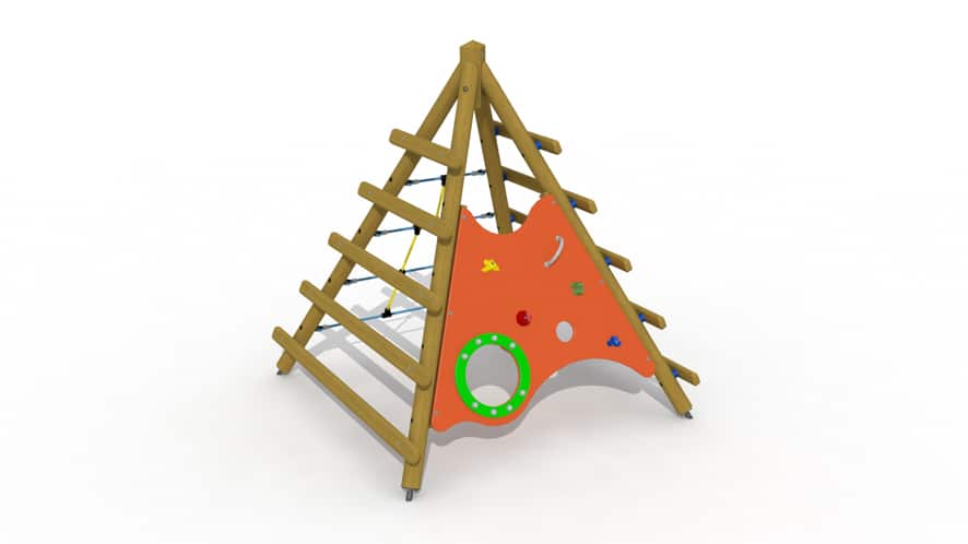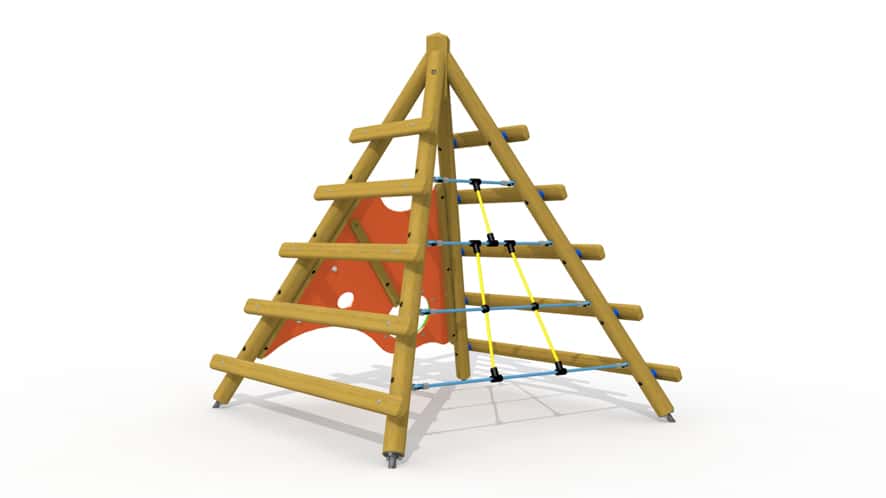 Klimtoestel in de vorm van een pyramide voor kinderen van 4 tot 10 jaar. Het toestel is opgebouwd uit 2 houten klimladders, een oranje HDPE klimpaneel met verschillende klimgrepen en handvatten uit kunststof en een klimnet. De rondhouten lariks palen van diameter 10 cm en buiten het hart gezaagd worden met metalen voetsteunen in de grond geplaatst. Alle moeren en bouten zijn volledig afgeschermd met bloemvormige kunststof afdekdoppen.