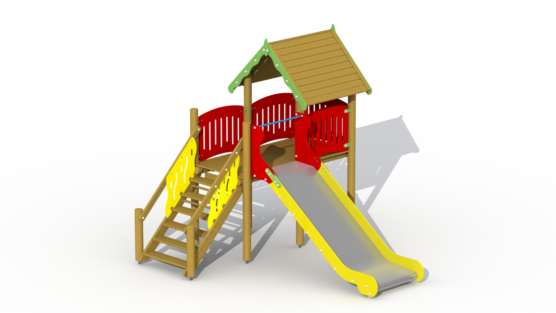 Een platform gebouwd op zes rondhouten lariks palen waarvan de helft bestaat uit een huisje met zadeldak dat kan verlaten worden via een inox glijbaan van 1 meter breed. Het geheel is te bereiken via een gemakkelijke trap en is geschikt voor kinderen van 3 tot 12 jaar. Het speelhuisje kan gecombineerd met de volgende aanbouwelementen: apenladder (S005), klimboog (S006), rotswand (S007), lage glijstang (S008), zandwerkplaats (S009), aanbouwnet (S013), lage spiraalglijstang (S014), zitbalk met 3 zitplaatsen (S019) en/of spelpanelen (S033-S038). De rondhouten palen worden met metalen voetsteunen in of op de grond geplaatst. Alle metalen onderdelen zijn roestvrij voorbehandeld en alle moeren en bouten zijn volledig afgeschermd met bloemvormige kunststof afdekdoppen.Er is keuze tussen rode of groene zijwanden op alle structuren!