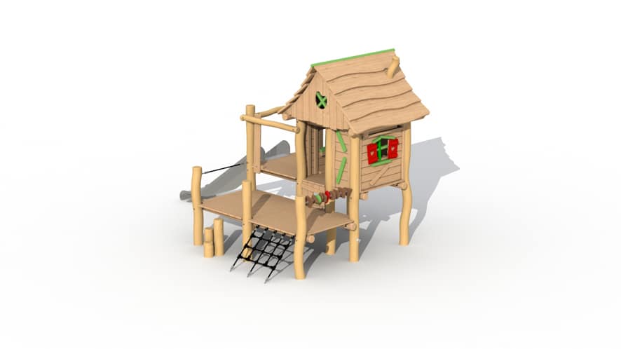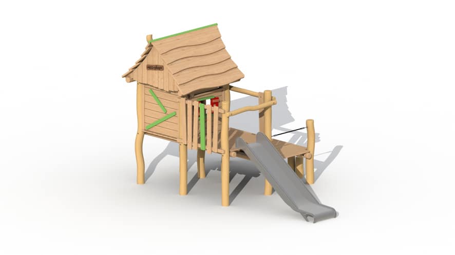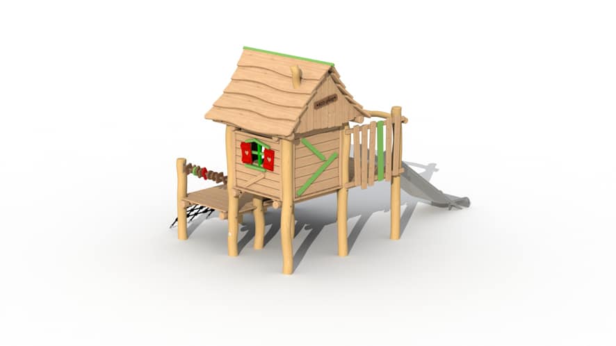 Het speeltoestel is opgebouwd uit een verhoogd huisje met terrasje en kunststof glijbaan (beschikbaar in groen en geel). Het terras kan bereikt worden door middel van 3 stappaaltjes of een klimnetje. Het huisje is binnenin voorzien twee zitbankjes en een tafeltje en heeft 2 raampjes waardoor de kinderen in het huisje interactie kunnen hebben met de kinderen buiten het huisje. De raampjes zorgen er ook voor dat de kleintjes altijd in het zicht zijn van de volwassenen. Het huisje is voorzien van een leuk terrasje waarop de kinderen op uitkijk kunnen staan. Aan het terrasje is ook een telraam aanwezig.