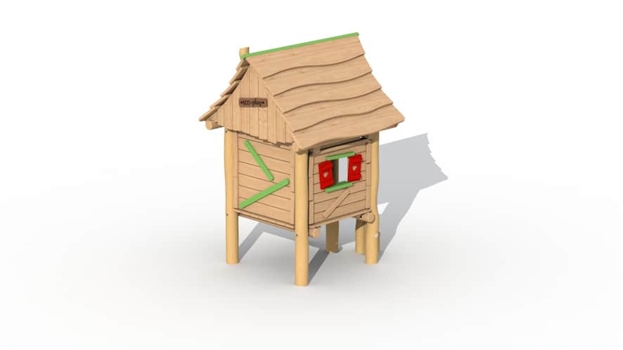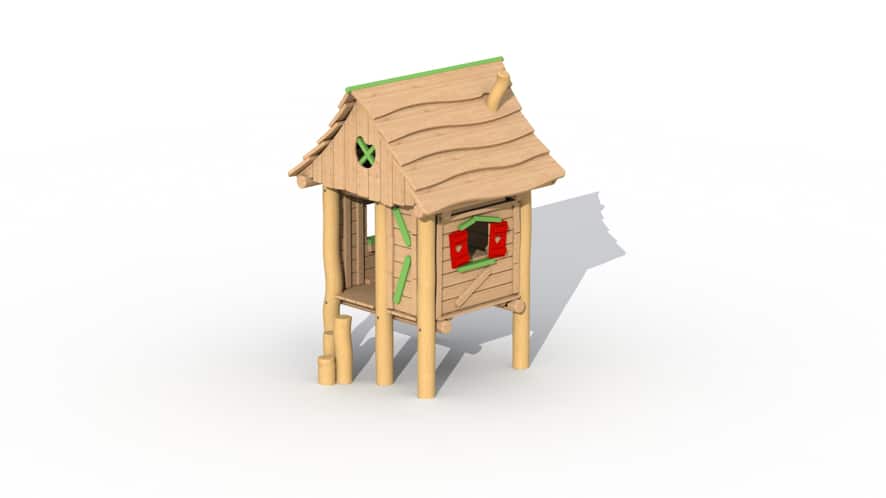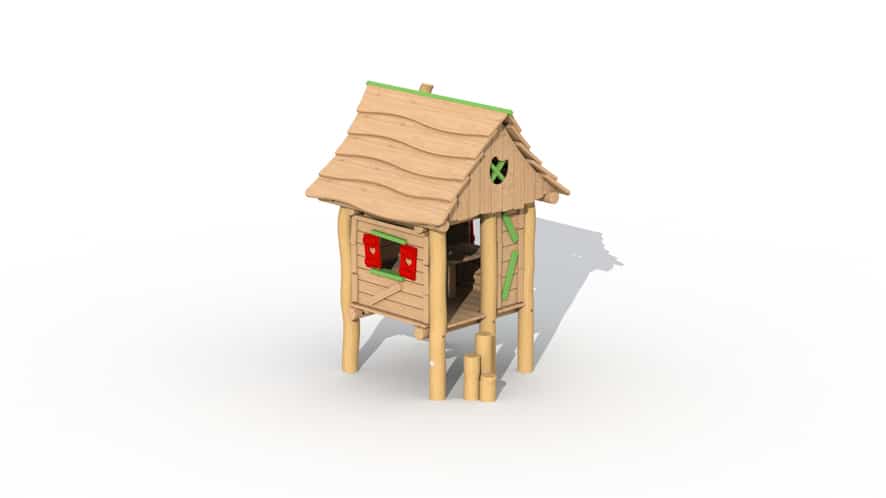 Speeltoestel voor de allerkleinsten, van 2 tot 6 jaar opgebouwd uit lariks en robinia. Het speeltoestel bestaat uit een verhoogd huisje dat te bereiken is door middel van stappaaltjes. Deze stappaaltjes zorgen voor wat meer uitdaging voor de iets oudere kleutertjes. Het huisje is binnenin voorzien twee zitbankjes en een tafeltje en heeft 2 raampjes waardoor de kinderen in het huisje interactie kunnen hebben met de kinderen buiten het huisje. De raampjes zorgen er ook voor dat de kleintjes altijd in het zicht zijn van de volwassenen. Het houthakkershutje wordt deels voorgemonteerd geleverd.