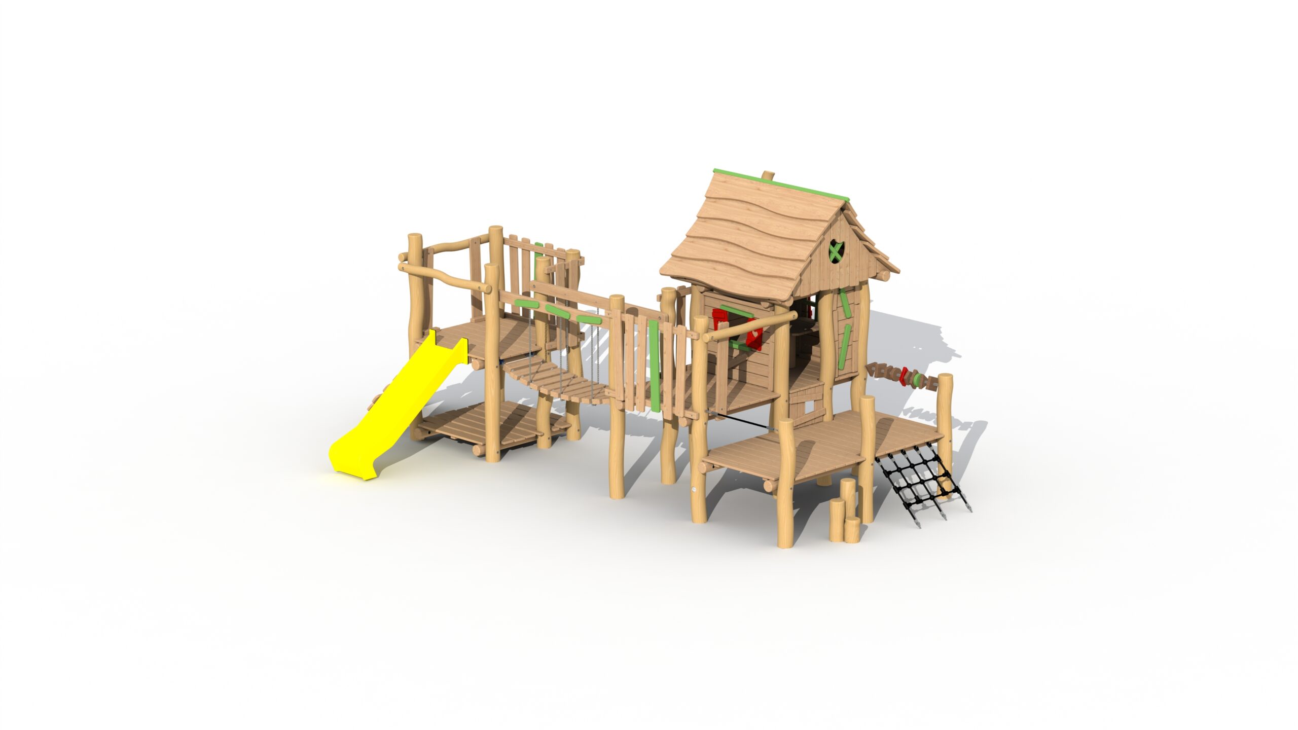 Het speeltoestel is opgebouwd uit verschillende platformen en speelelementen. Kinderen kunnen op het verlaagde platform klimmen via het klimnet of er op klauteren via de stappaaltjes. Aan dit platform zijn telschijfjes voorzien waar kinderen de eerste stappen richting tellen zetten. Via een opstapje kunnen kinderen vanaf dit platform het huisje bereiken. Het huisje is binnenin voorzien van 2 bankjes en een tafeltje en heeft ook 2 raampjes. Via het platform naast het huisje kunnen de kinderen via de soepele loopbrug de andere kant van het speeltoestel bereiken. De soepele loopbrug is bevestigd door middel van vuurverzinkte kettingen, de plankjes hangen met staalkabels aan elkaar vast. Aan de andere zijde van het speeltoestel is een torentje zonder dak dat bereikt kan worden door middel van een klimmuur met padouk klimgrepen.