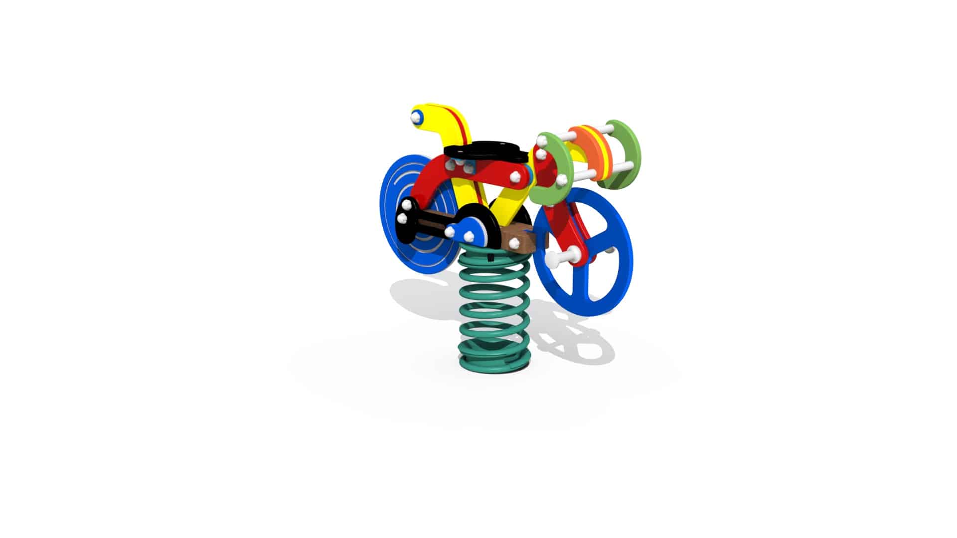 Veertoestel voor kinderen van 2 tot 6 jaar. Het veertoestel is opgebouwd uit een polyestergecoate veer die verankerd is op een gegalvaniseerde grondbevestiging. Bovenop staat een figuratief zitelement gemonteerd in de vorm van een racefiets. De figuren en zitvlakken zijn opgebouwd uit vandalismebestendig en kleurvast 19mm HDPE polyethyleen. De veer is vervaardigd uit 20 mm dik veerstaal. Alle metaalonderdelen zijn roestvrij voorbehandeld en alle moeren en bouten zijn volledig afgeschermd met bloemvormige afdekdoppen. De veer is zodanig ontworpen dat men nooit geklemd kan raken, ook niet bij de zwaarste belasting. De elasticiteit van de veer is zo berekend dat de beweging ook voor de kleintjes volledig tot zijn recht komt. Het achterwiel van de racefiets kan draaien.